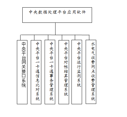 水电气一卡通收费系统工程应用软件是一套全过程、全方位的现代化市民收费卡管理信息系统,共包括中央数据处理平台应用软件、计费单位接口应用软件两大部分共9个系统,如下图: